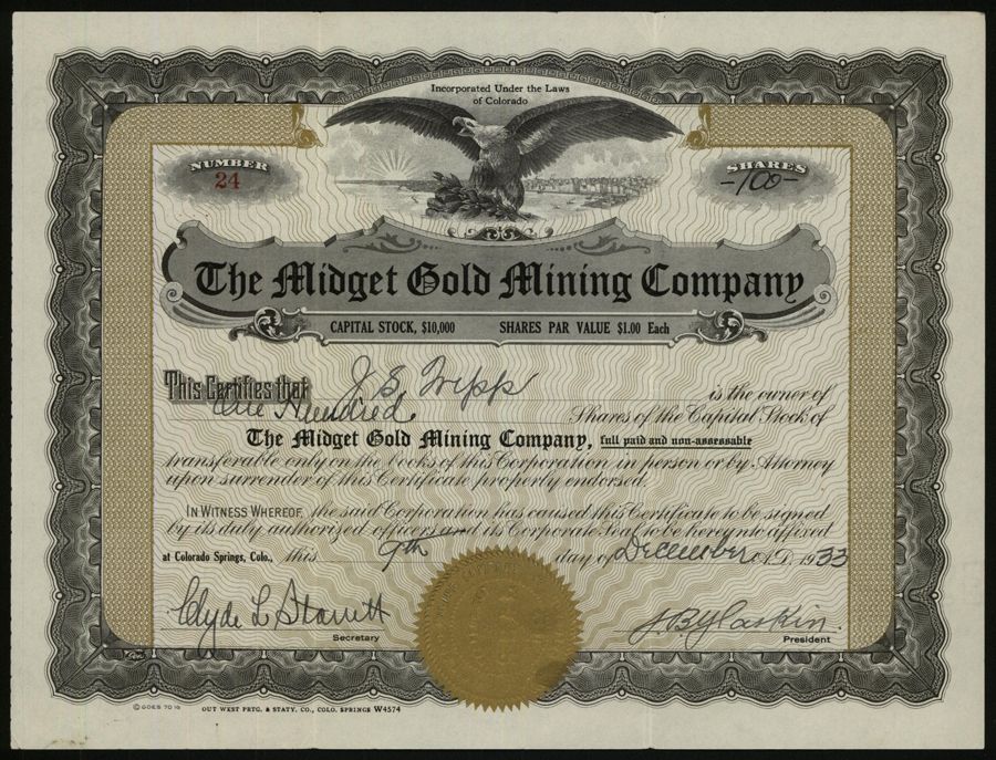 Colorado, 1933, Issued and Uncancelled Stock, 100 Shares, #24, Black print with black and gold border with gold seal bottom center, Bald Eagle with harbor and city in the distance, VF condition, Out West Printing & Stationary Co.