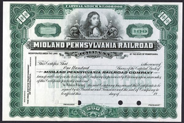 Pennsylvania. 100 Shares Capitol Stock, Specimen Certificate. Black print with ornate green border and under print. Vignette of William Penn at top of certificate. POC's, VF condition.