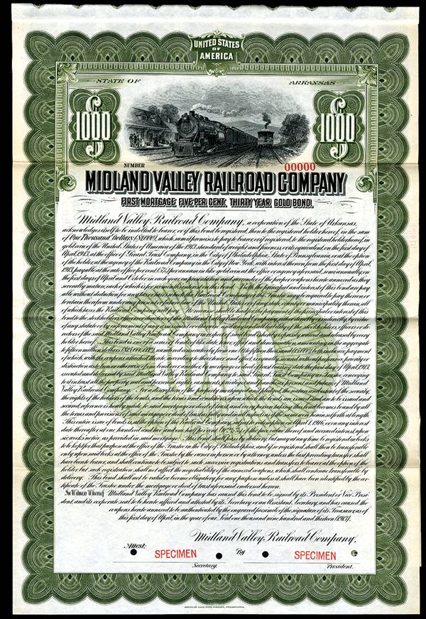Midland Valley Railroad Co., 1913 Specimen Bond. Arkansas. 1913, $1000, Specimen 1st Mortgage, 5% Gold Coupon Bond, Black on olive green border, train at station R-L. VF-XF, ABNC. Only known in specimen format in Cox. Unlisted bond design, color and type in Cox.