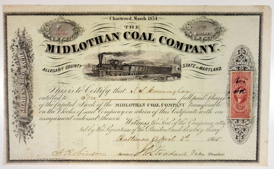 Baltimore, Maryland. 10 Shares Capital Stock I/U Stock Certificate, Black print on simple black border with pale green under tint, Locomotive with cars of coal at top, Fine-VF condition, Hatch & Co.