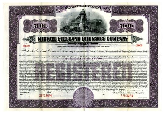 Delaware. $5000 Specimen 5% Registered Convertible Sinking Fund Gold Bond, Black print on purple border and under tint in horizontal format, Locomotive pulling up beside factory at top, Specimen overprints and POC's, VF-XF condition, ABNC. Midvale Steel Works was located at Nicetown, Philadelphia, Pennsylvania, which operated from 1867 until 1976. The company was most notable for producing high-quality steels and for providing the casting, forging, and machining needed to use them in special applications such as heavy artillery; steam turbines; naval armor plate; and pressure vessels for use in chemical plants.