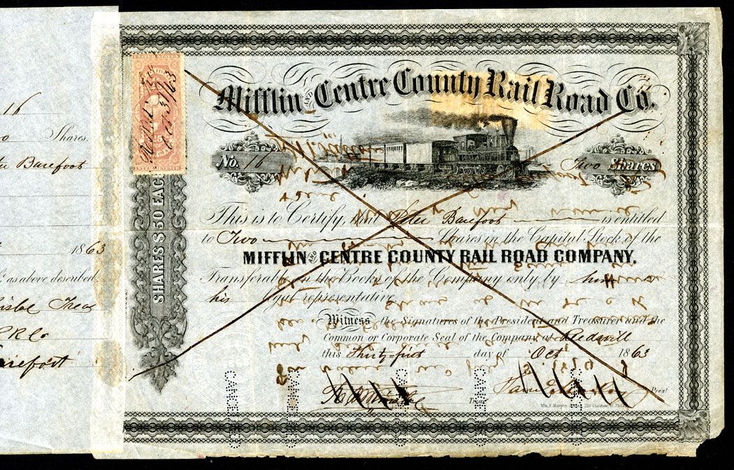 Pennsylvania, 1863, Mifflin & Centre County Railroad Co. 2 Shares, $50 each, Stock Certificate, VF Condition.