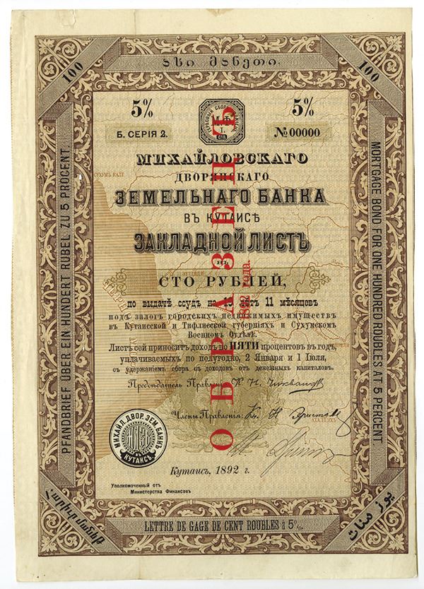Imperial Russia, 1892, specimen 100 Ruble 5% bond, small size certificate with no coupons attached, series 2 serial 00000, overprinted "________" in red (Russian for specimen), bank seal at bottom, ornate brown frame, text in multiple languages including Russian, French, German, English, and others. Underprint of map in middle. Very Fine with minor tear.