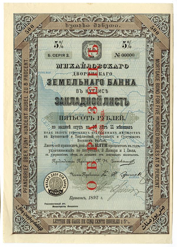 Imperial Russia, 1892, specimen 500 Ruble 5% bond, small size certificate with no coupons attached, series 2 serial 00000, overprinted "________" in red (Russian for specimen), bank seal at bottom, ornate blue frame, text in multiple languages including Russian, French, German, English, and others. Underprint of map in middle. About Extra Fine with minor margin tear.