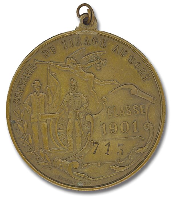 France, 1901 bronze 50 mm with suspension ring, Female seated at battlefield with flag. Reverse inscribed class 1901 #713 By A. Duseaux. Very Fine.