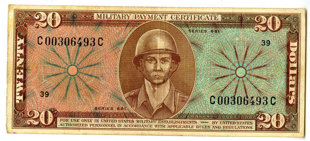 Washington, D.C., ND (1969-1970). MPC, $20, P-M82, Military Payment Certificate, Series 681, Brown printing on m/c underprint with helmeted solider at center, Back is red on brown underprint with fighter plane at center, serial # C00306493C, Choice Fine to VF condition.
