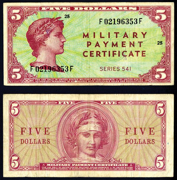 U.S., M.P.C., $5, P-S856-1, Issued banknote, Lilac, light turquoise blue and light yellow with woman with wreath on left, back lilac with young woman, S/N F 02196353 F, pp 25, PMG graded Very Fine 25, Rare note in higher graded and this is very attractive for issue.