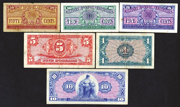 United States. MPC Series 611 5c, 10c, 50c $1, $5, $10. Generally Fine to Very Fine. 6 pieces