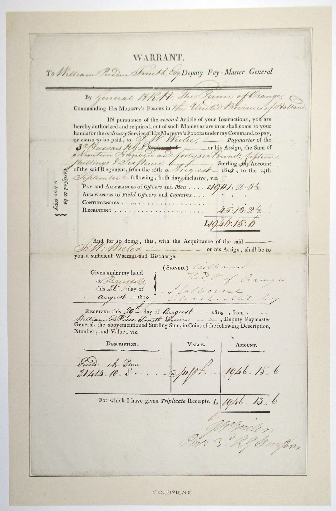 Holland, 1814. Payment Warrant issued to General H.R.H The Prince of Orange for "commanding His Majesty's Forces in The United Provinces of Holland." Outlines payments, allowances, and final sums issued by the Deputy Pay-Master General. This document provided finances to William of Orange, as well as his forces, for service under His Majesty's military. At the time, George IV was serving as regent during his father's, George III, mental illness. Signed by William of Orange, as well as John Colborne. William II (December 1792 Ð 17 March 1849) was King of the Netherlands, Grand Duke of Luxembourg, and Duke of Limburg. William II was the son of William I and Wilhelmine of Prussia. When his father, who up to that time ruled as sovereign prince, proclaimed himself king in 1815, he became Prince of Orange as heir apparent of the Kingdom of the Netherlands. With the abdication of his father on 7 October 1840, William II became king. During his reign, the Netherlands became a parliamentary democracy with the new constitution of 1848. He entered the British Army, and in 1811, as a 19 year old aide-de-camp in the headquarters of Arthur Wellesley, 1st Duke of Wellington, was allowed to observe several of Wellington's campaigns of the Peninsular War. Though not yet 20, the young prince, according to the customs of the time, was made lieutenant colonel on 11 June 1811 and colonel on 21 October that year. On 8 September 1812 he was made an aide-de-camp to the Prince Regent and on 14 December 1813 promoted to major-general. He returned to the Netherlands in 1813 when his father became sovereign prince, and in May 1814 succeeded Sir Thomas Graham as the highest-ranking officer of the British forces stationed there. Just a few months after this warrant was issued, William of Orange went on to be promoted to lieutenant-general in the British Army. Field Marshal John Colborne, 1st Baron Seaton, GCB, GCMG, GCH, PC (Ire) (16 February 1778 Ð 17 April 1863) was a British Army officer and colonial governor. After taking part as a junior officer in the Anglo-Russian invasion of Holland, Sir Ralph Abercromby's expedition to Egypt and then the War of the Third Coalition, he served as military secretary to Sir John Moore at the Battle of Corunna. He then commanded the 2nd Battalion of the 66th Regiment of Foot and, later, the 52nd Regiment of Foot at many of the battles of the Peninsular War. At the Battle of Waterloo, Colborne on his own initiative brought the 52nd Regiment of Foot forward, took up a flanking position in relation to the French Imperial Guard and then, after firing repeated volleys into their flank, charged at the Guard so driving them back in disorder. He went on to become commander-in-chief of all the armed forces in British North America, personally leading the offensive at the Battle of Saint-Eustache in Lower Canada and defeating the rebel force in December 1837. After that he was high commissioner of the Ionian Islands and then Commander-in-Chief, Ireland. Rare and fascinating piece of early 1800s military history which features a pair of famous figures. (John E. Herzog Collection)