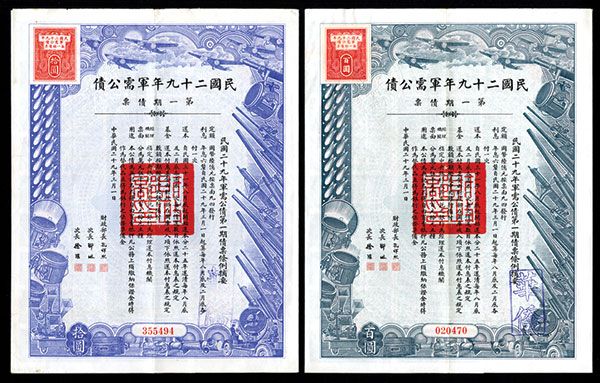 China. Lot of 2 bonds. Includes 10 Yuan, blue and 100 Yuan, gray bonds, both with airplanes, bombs, guns and searchlights, 44 coupons present on both. VF-XF.