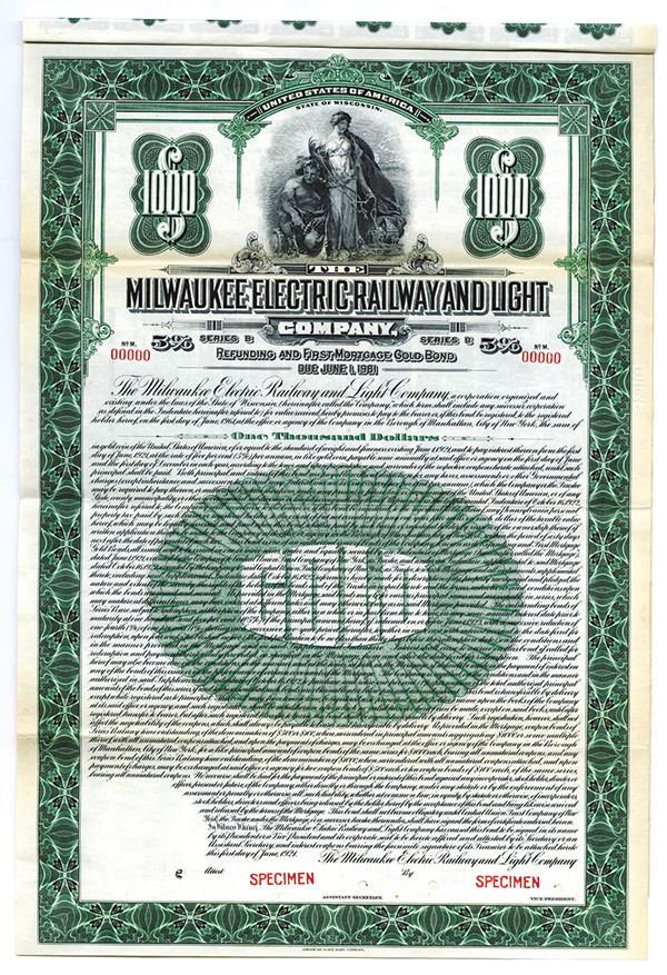 Wisconsin, Lot of 3 bonds from the same series, Includes $100, brown; $500, orange and $1000, green, all are Series "B", Refunding and 1st Mortgage 5% Gold Coupon Bond Specimens, All with attractive vignette of Foringer Painted Allegorical woman with generator and man at top center, POC's and red SPECIMEN overprints, VF condition, ABNC. The $500 and $1000 denominations from this series are listed in Cox, the $100 is unlisted. Attractive and rare bond series with only 3 complete sets of 3 found in the archives.