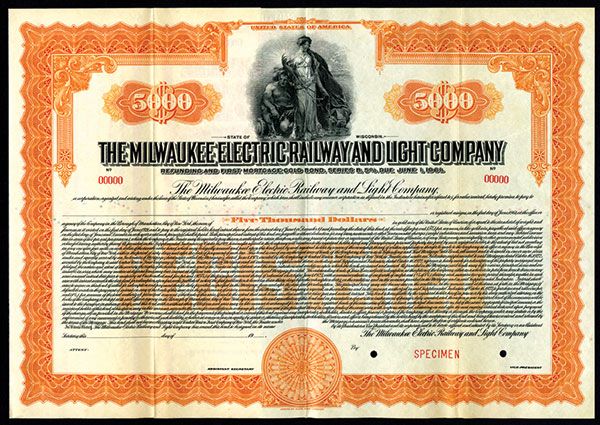 Wisconsin. 1921. $5000 1st Mortgage Series B 5% Gold Specimen Bond. Allegorical figures top center. POC's and red SPECIMEN overprints. VF-XF condition. ABNC. Unlisted railroad in Cox.