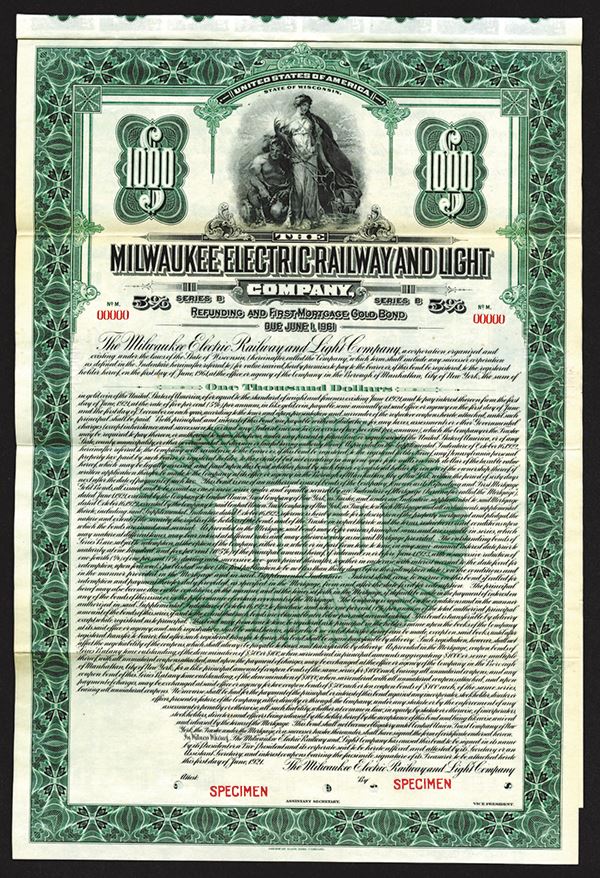 Wisconsin. 1921. Specimen $1000 Refunding and 1st Mortgage 5% Gold Coupon Bond. Allegorical figures top center. POC's and red SPECIMEN overprints. VF-XF condition. ABNC. Unlisted railroad in Cox.