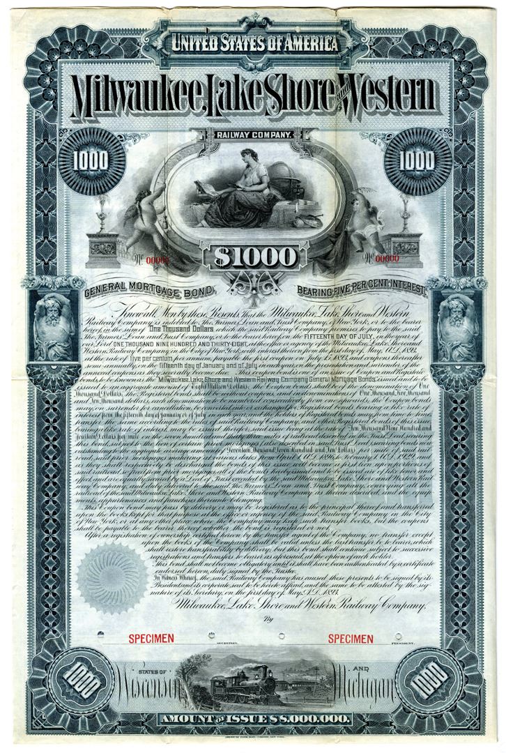 WI & MI, 1893. $1000 Specimen 5% General Mortgage Bond, Black text with navy border and undertint, Seated woman reading a book depicted at top center, flanked by allegorical cherubs. Red specimen overprints, 00000 serial numbers, POCs, VF condition, ABNC. Only 3 examples found in the ABN Archives in 2002 and this is the only example available.