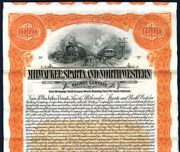 Wisconsin. 1912. $1000 1st Mortgage 4% Gold Specimen Bond with coupons attached. Locomotive approaching head-on with one leaving top center. POC's and blue SPECIMEN overprints. VF-XF condition. ABNC. Unlisted railroad in Cox.