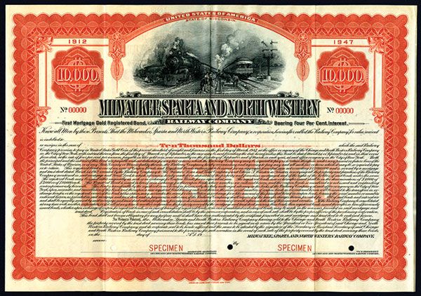 Wisconsin. 1912. $10000 1st Mortgage 4% Registered Gold Specimen Bond. Locomotive approaching head-on with one leaving top center. POC's and red SPECIMEN overprints. VF-XF condition. ABNC. Unlisted railroad in Cox.