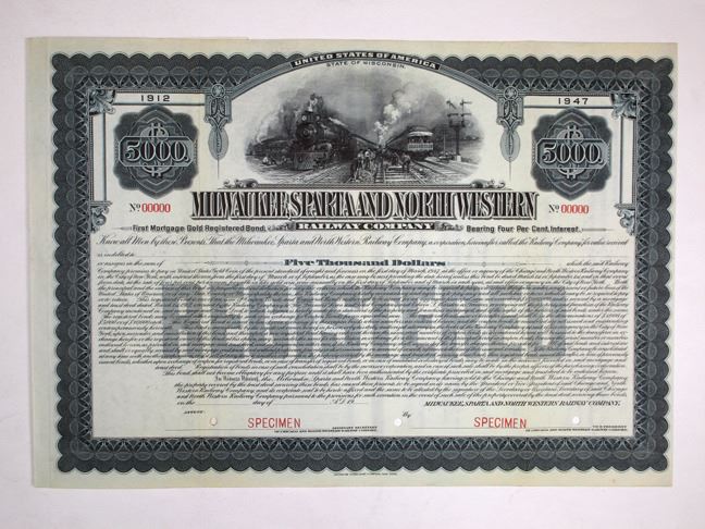 Milwaukee, Wisconsin, 1912. $5000 Specimen 4% Registered First Mortgage Gold Bond, Black on steel gray border and underprint, Men repairing tracks between two trains at top, Specimen overprint and POCs, VF-XF condition, ABNC. Rare bond, only known as a specimen in Cox, no issued examples known.