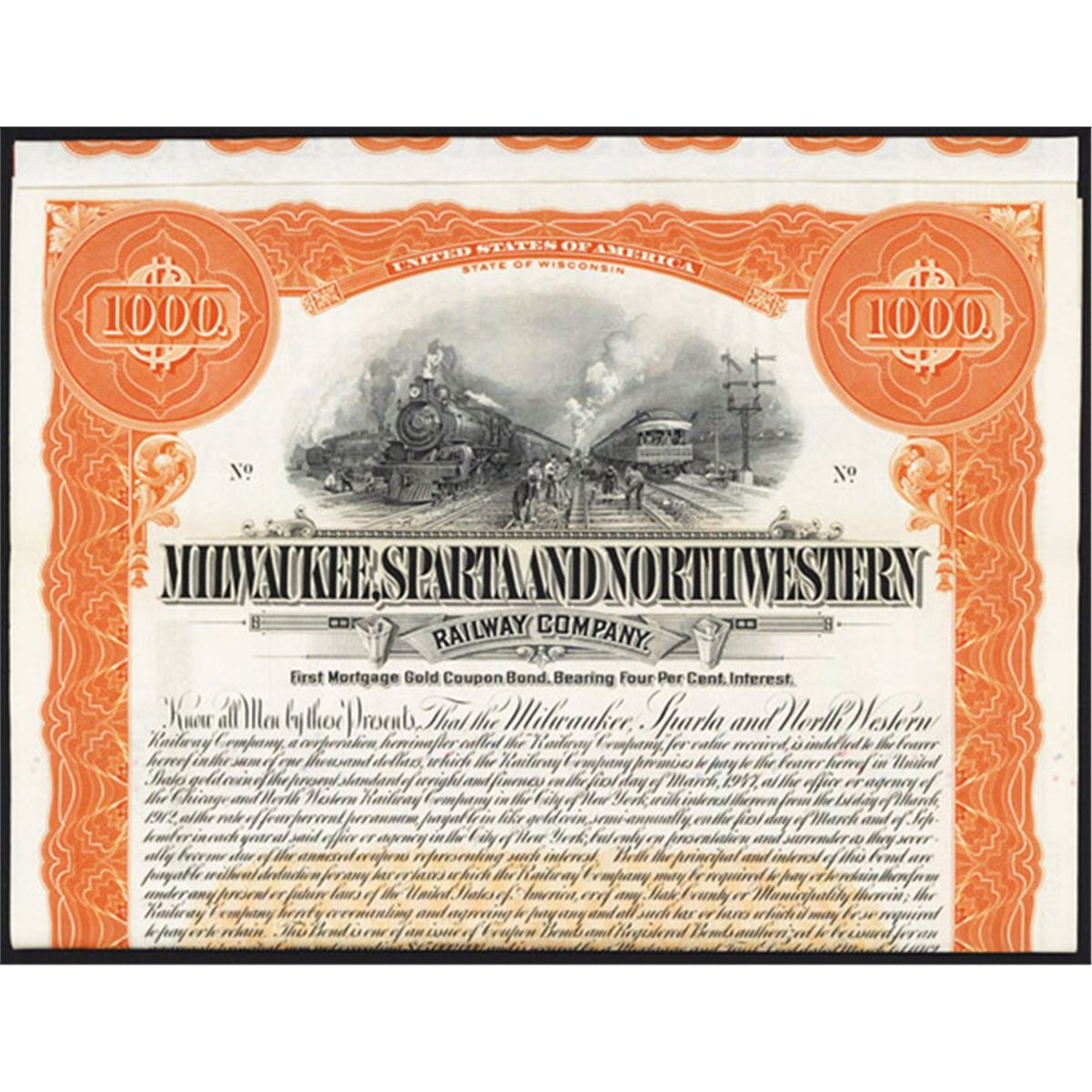 Wisconsin, 1912, Vertical $1000, 4% 1st mortgage gold coupon bond specimen with coupons, orange border, Locomotives and workers vignette, Specimen overprints, POCs, ABNC.