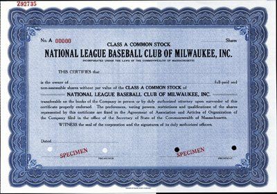 ca.1953-66. Odd Shs. Specimen stock certificate. Red "Specimen" overprints, "00000" serial numbers and POC's. No vignette. Class A Common Stock. Blue border. Historic baseball stock certificate from the Milwaukee "Braves" baseball team era. The "Braves" moved from Boston, MA in 1953 to become the Milwaukee Braves while the "Brewers" were the Braves local farm team. Hank Aaron and Eddie Matthews hit 850 home runs during the Braves tenure in Milwaukee. In 1966 the Braves moved to Atlanta. Bud Selig was owner of the Milwaukee Brewers after the Braves left Milwaukee and founded the new Milwaukee team after buying the bankrupt Seattle franchise in 1970. Choice uncirculated. This could be considered either an Atlanta Braves predecessor certificate or Milwaukee Brewers predecessor certificate. Let's see who hits a home run and wins it, a Braves or a Brewers fan. ABNC.