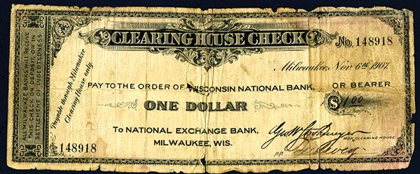WI, Nov. 6, 1907, $1, Issued Panic Scrip, VG to Fine condition.