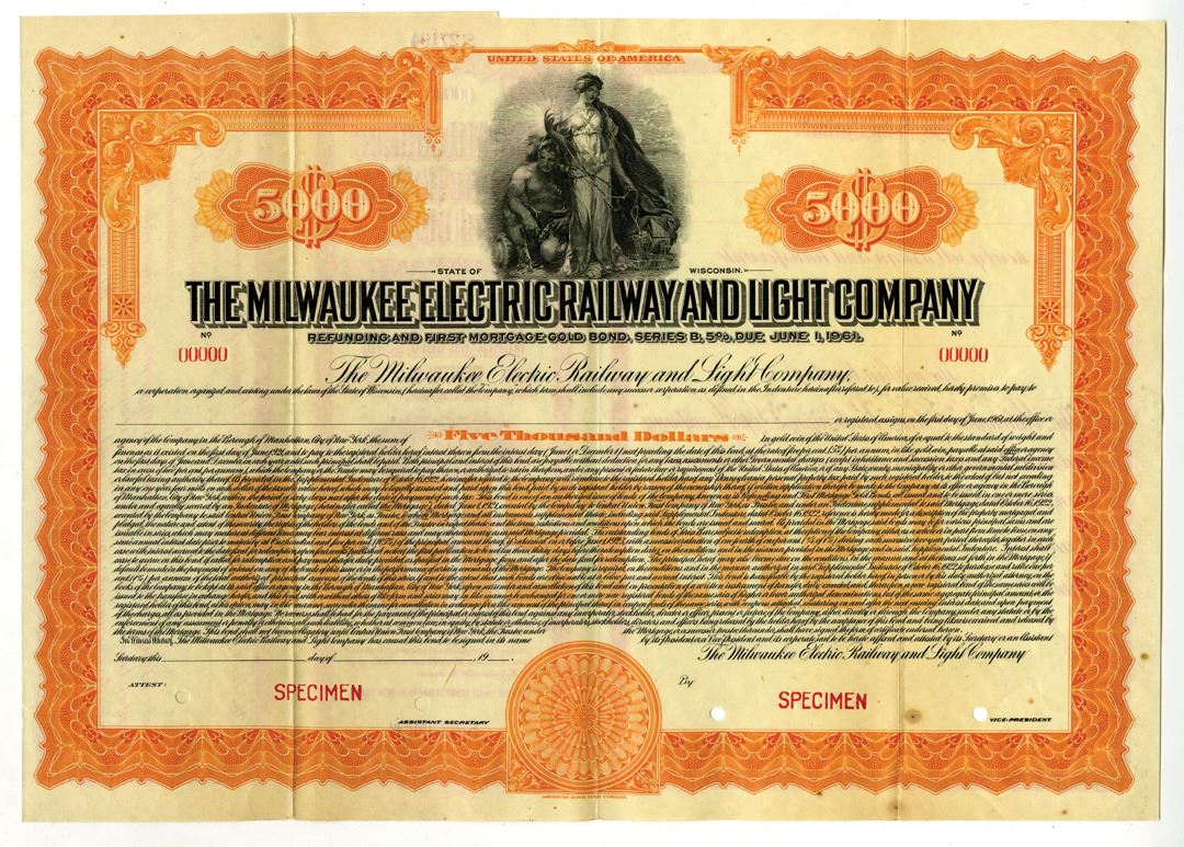 Milwaukee, Wisconsin, 1921 and 1925. Lot of 2 Specimen Bonds. Includes: 1921, Milwaukee Electric Railway and Light Co., $5000 5% Registered Refunding and First Mortgage Gold Bond in orange; and, 1925, Chicago, Milwaukee, St. Paul and Pacific Railroad Co., $100 5% Convertible Adjustment Mortgage Gold Coupon Bond. Both are in VF condition with archival repairs along splitting fold lines, and toning. ABNC. (2)