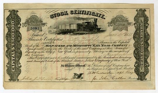 Wisconsin, 1858. 25 Shares Capital Stock I/U Certificate, Black on black border, Locomotive passing at top, Fine-VF condition, Toppan, Carpenter & Co.
