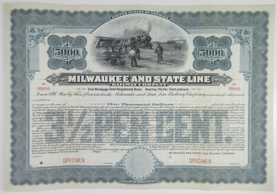 Wisconsin. $5,000 Registered 3 1/2% Specimen First Mortgage Gold Bond, Black print on blue gray border and under print on horizontal format, Men working in railyard at top, Specimen overprints and POC's, VF-XF condition, ABNC. Listed railroad in Cox, unlisted Bond type. Only known as a specimen in Cox.