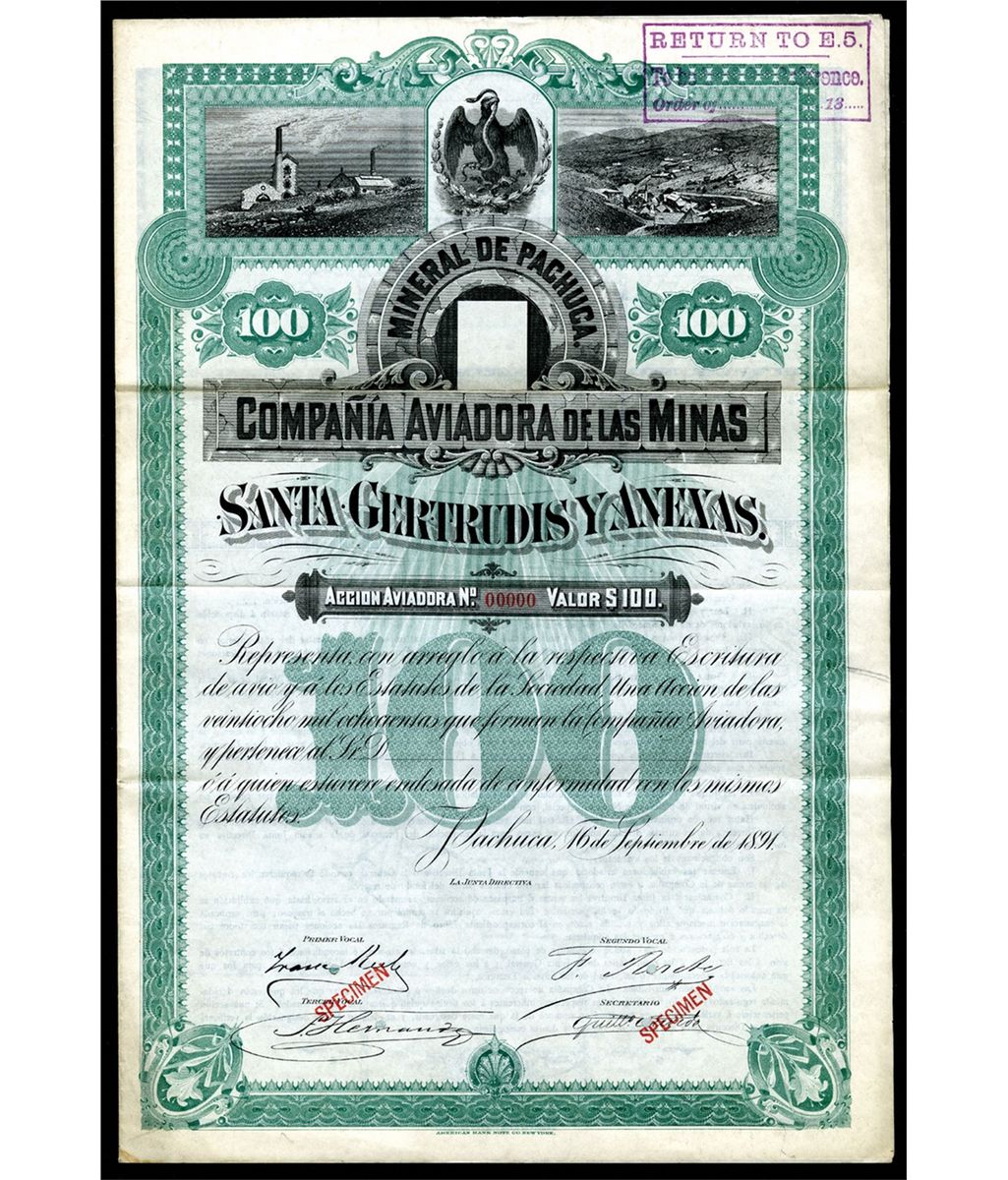 Pachuca, Mexico. 1891. 100 Pesos. Green border. Arms of Mexico flanked with mine on left and town on right. Fine to VF condition. Coupons attached. ABNC.