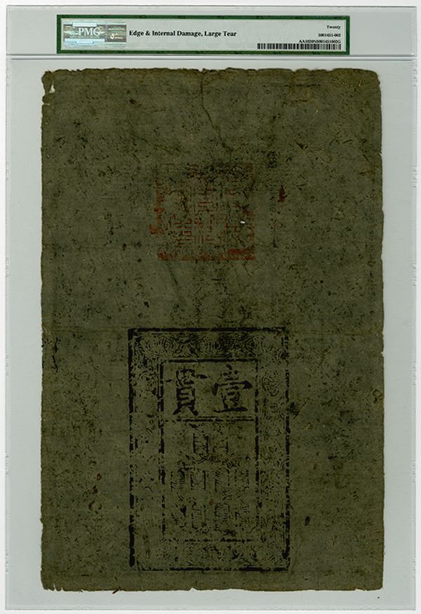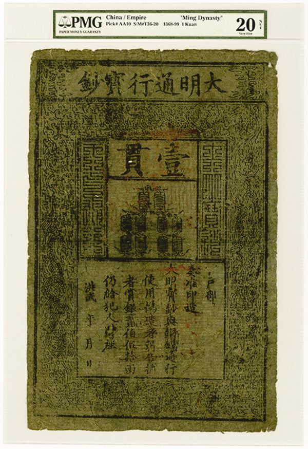 China. 1368-99. 1 Kuan, P-AA10, S/M#T36-20, Issued banknote. 10 Strings of Cash Coins at top center on front and back center at bottom. 2 large red seals on face and one on back. Printed on dark gray mulberry paper. PMG graded Very Fine 20 NET with note of edge faults, thins and internal tears and large f, but still intact, rare and historic banknote. This note came from a group of these notes that were discovered during the ñBoxer Rebellionî. The notes were printed by the ñHung-wu Emperorî to create a national currency. The legends on the notes cites the authority of Hung-wu, the punishment for counterfeiting and reward for informants. The term Kuan (Quan, Kwan) relates to the Quan system of money (silver bars). This is the earliest form of printed currency available.