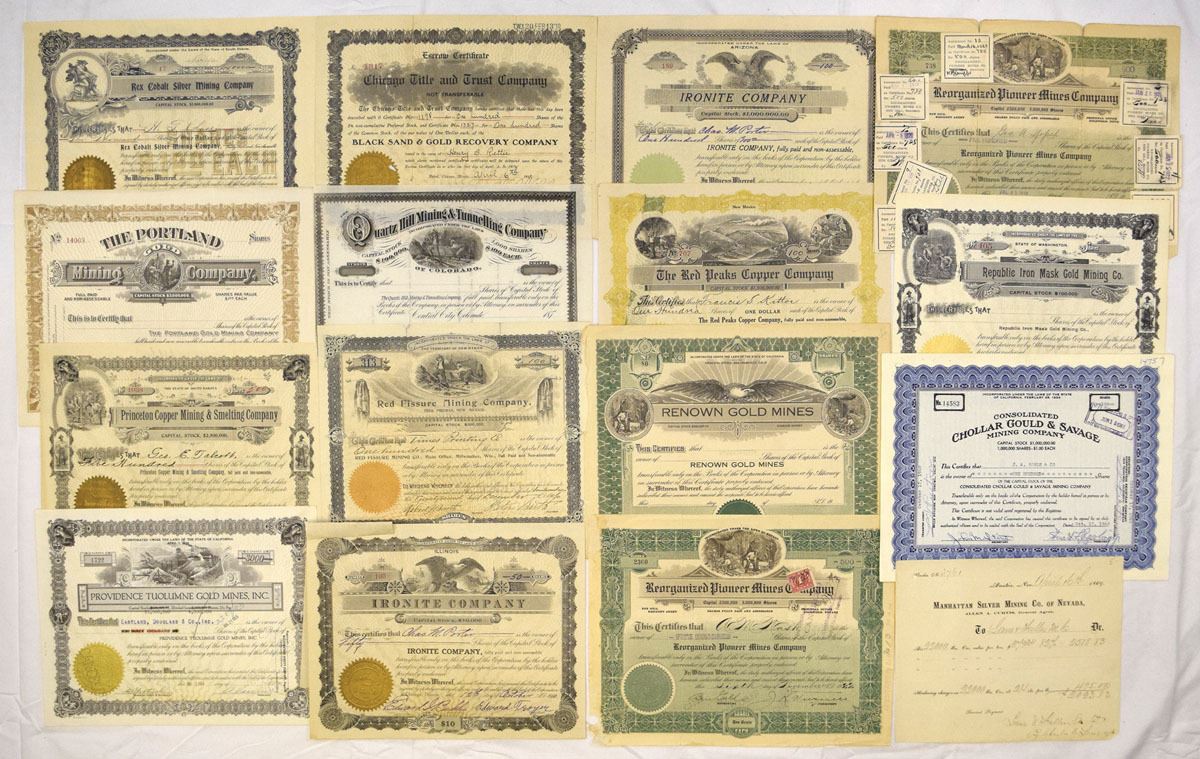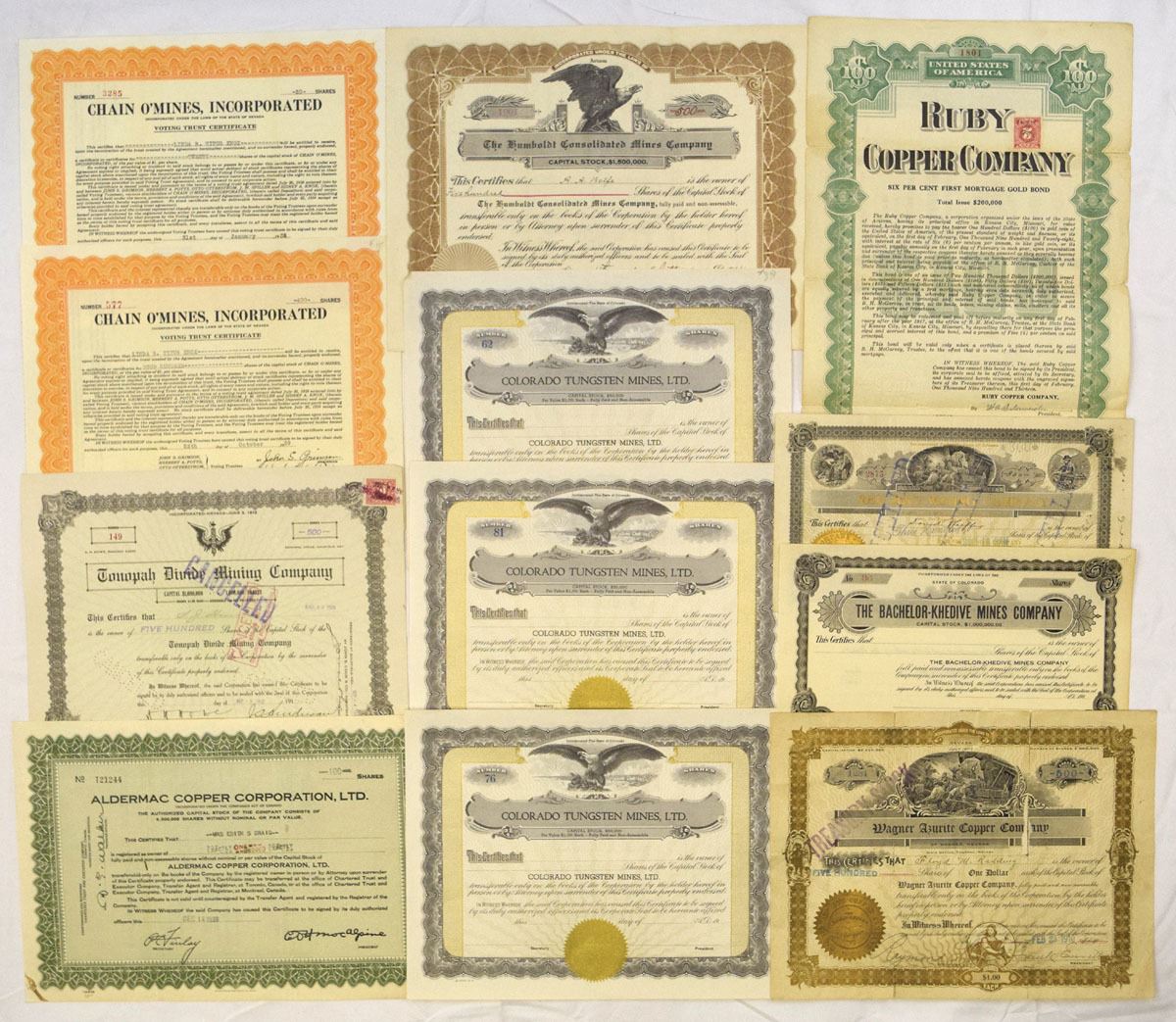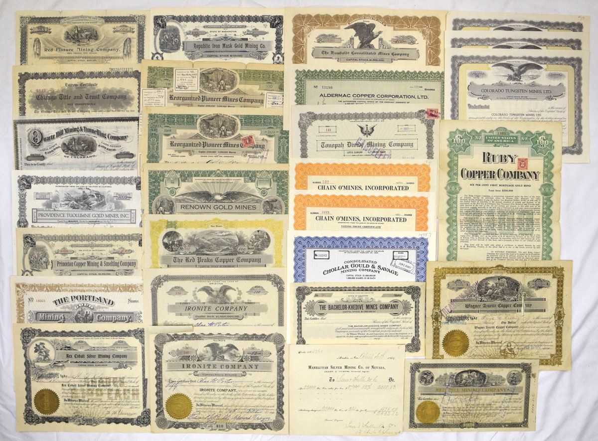 Various States....... Lot of 28 issued stock certificates representing gold, silver, copper, and tungsten mining enterprises across the western United States. Notable companies visible in the group include Colorado Tungsten Mines Ltd.; Aldermac Copper Corporation Ltd.; Ruby Copper Company; Tonopah Divide Mining Company; Renown Gold Mines; Reorganized Pioneer Mines Company; Providence Tuolumne Gold Mines Inc.; The Portland Gold Mining Company; Chain O’Mines Inc.; Republic Iron Mask Gold Mining Co.; Rex Cobalt Silver Mining Company; and Wagner Butte Copper Company, among others. Certificates display classic engraved mining imagery including eagles, underground workings, miners, allegorical figures, and western landscapes, with ornate borders, period typography, serial numbers, handwritten signatures, and applied seals. A variety of capital structures and share formats is present. Conditions range from VG to XF overall, with expected folds, cancellations, edge wear, and handling consistent with age. (28). Sold “AS IS” no returns accepted.
