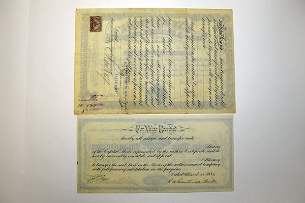 California, Lot of 2 stock certificates, Includes 1882, Calaveras Water and Mining Co., 100 Shares, I/U, Black on green border, Location of property Calaveras County, CA., Franklin BNC; and 1883, Excelsior Water and Mining Co., 100 Shares, I/U, Works in Yuba & Nevada Counties, Cal., ABNC, Both are in VF-XF condition.