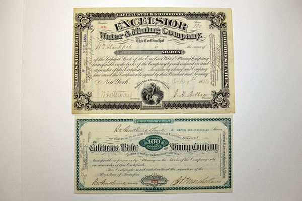 California, Lot of 2 stock certificates, Includes 1882, Calaveras Water and Mining Co., 100 Shares, I/U, Black on green border, Location of property Calaveras County, CA., Franklin BNC; and 1883, Excelsior Water and Mining Co., 100 Shares, I/U, Works in Yuba & Nevada Counties, Cal., ABNC, Both are in VF-XF condition.