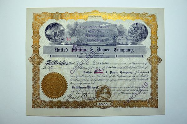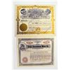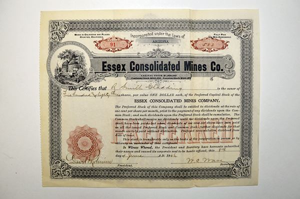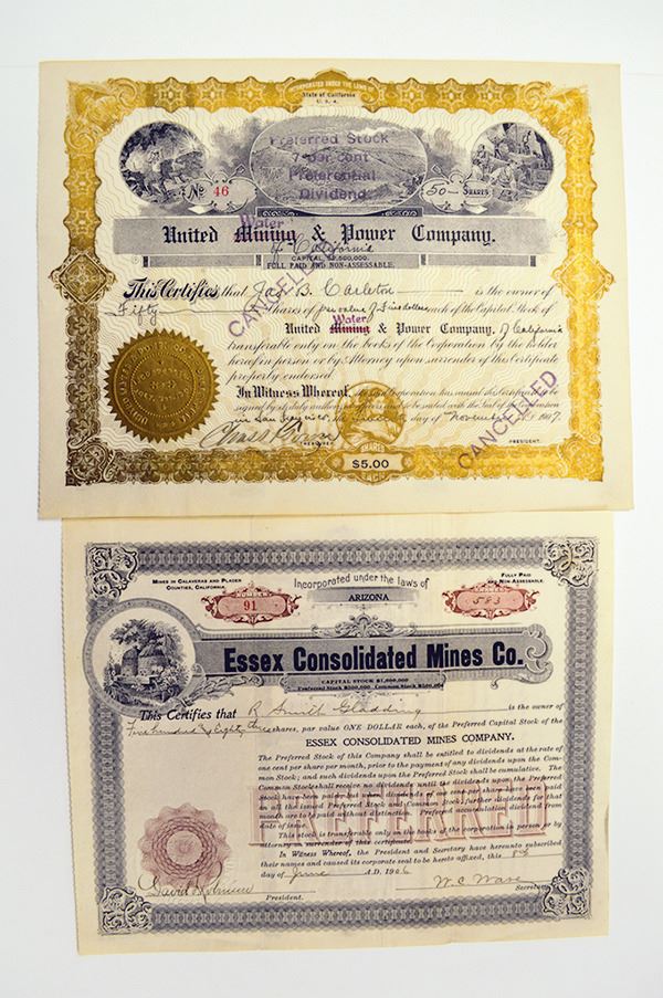 Arizona and California. Lot of 2 stock certificates. Includes 1906, Essex Consolidated Mines Co., 583 shares. I/U and 1907, United Mining and Power Co. (mining has been crossed out and replaced with Water), I/C for 50 shares. Both are in VF condition.