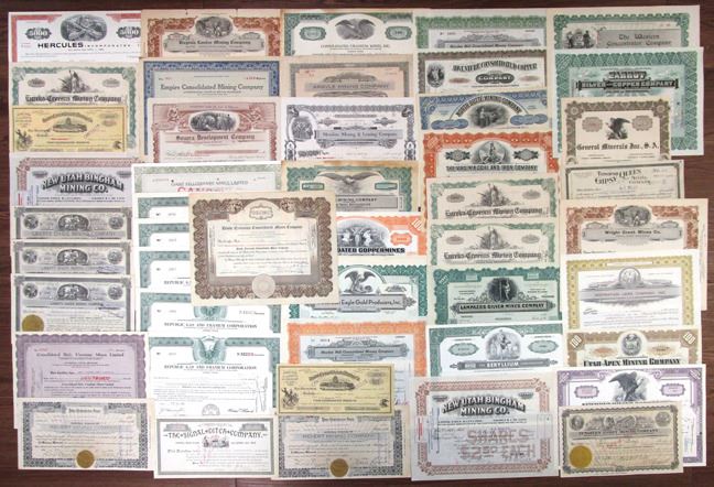 Nevada, Canada, Utah, Idaho, California, Montana and other states, Various Issuers, ca.1902-81. Lot of 47 Stock and Bond Certificates, Highlights Include: Union Consolidated Mining Co; Giant Yellowknife Mines, Ltd; Republic Gas and Uranium Corp (6); Argyle Mining Co; North Butte Mining Co; Hercules Inc; and more. Pieces range from Fine-VF condition. (47). Sold "AS IS" no returns accepted.