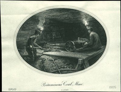 1905. Proof. Large format proof mining vignette 3.75 by 5 inches. Miners drilling for coal with open flame torches on their hats (seems like a recipe for disaster). Unc.