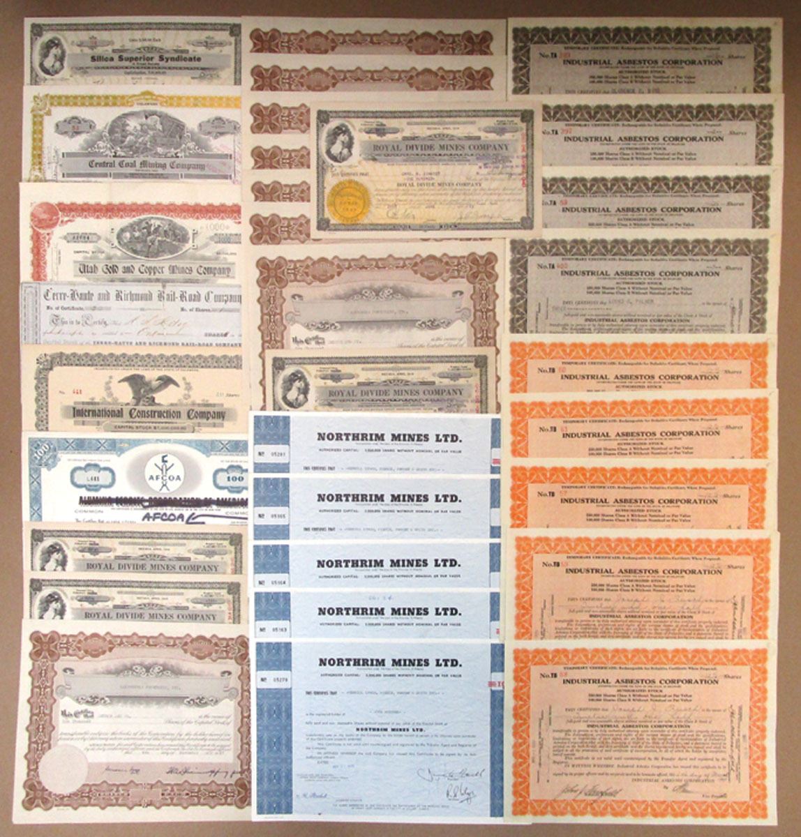 Various States, 1900-1976. Lot of 30+ Mining Related Stock Certificates from various companies, Includes: California Foundries, Inc., Royal Divide Mines Co., International Construction Co., Terre-Haute and Richmond Rail-Road Co., Utah Gold and Copper Mines Co., Central Coal Mining Co., Silica Superior Syndicate and more. Certificates range from Fine to VF+ condition. (32). Sold "AS IS" no returns accepted.