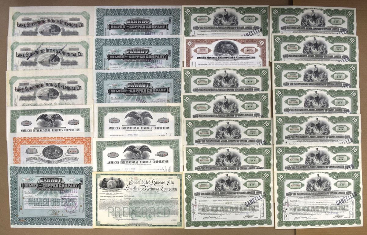 US & Canada, 1900-60s. Lot of 25+, I/C Stock Certificates related to the mining and metals sector, Includes: International Nickel Company of Canada, Limited; Sampson Silver and Copper Company; Lake Superior Iron & Chemical Co.; American International Minerals Corporation; Patino Mines & Enterprises Consolidated; Arizona Binghamton Copper Company and more. Certificates range from Fine to VF+ condition. (25+). Sold "AS IS" no returns accepted.