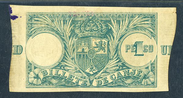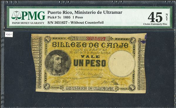 Puerto Rico, 1 Peso, P-7c, issued, black on yellow underprint, no counterfoil, PMG graded Choice Extremely Fine 45 NET with note of a small ink spot on the top right corner.
