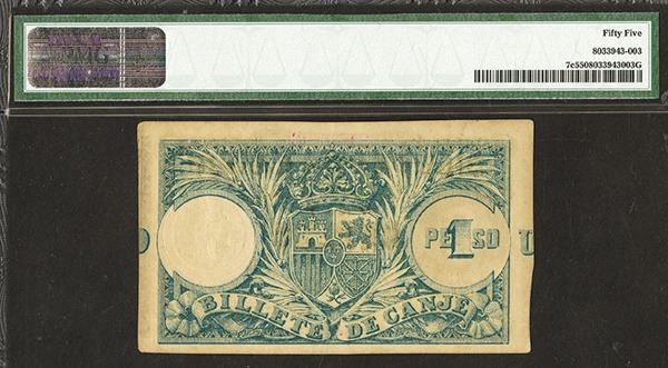 Puerto Rico, 1 Pesos, P-7c, issued banknote, Black on gold underprint, dark blue-green back, without counterfoil, PMG graded About Uncirculated 55, S/N 3880602, This is the second of two sequential banknotes offered in the auction.