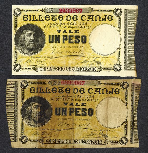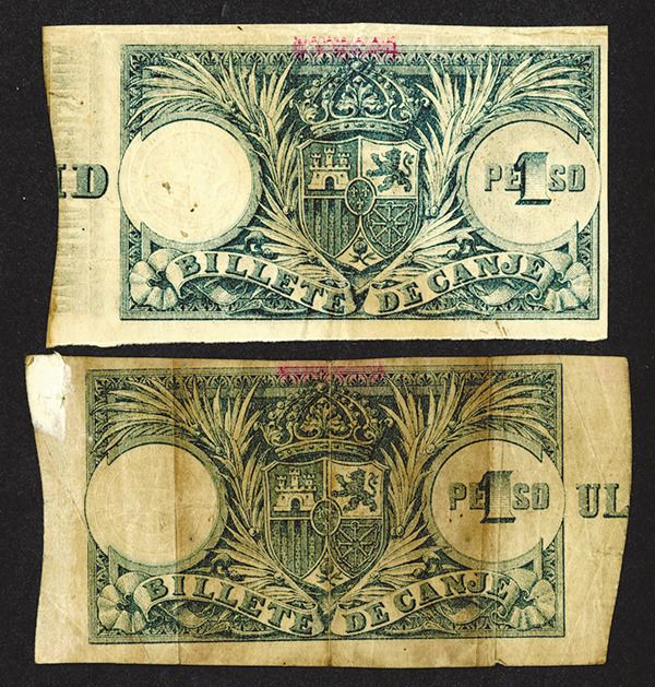 Puerto Rico. 1 Peso. P-7b. Male portrait at left end, arms at center on back. Partial end counterfoil on each. Very Fine; Very Good with old paper on top back corner. 2 pieces.