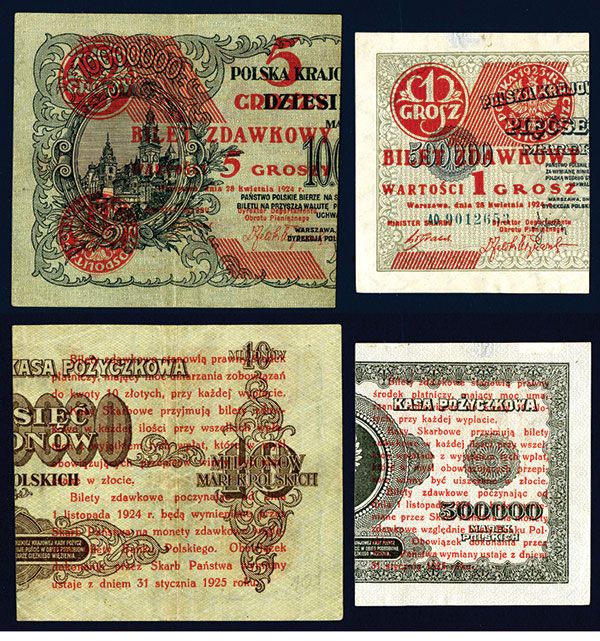 Poland, pair of bisected issued provisional notes dated 1924, includes 1 Grosz, P-42a, VF; and 5 Groszy, P-43a, VF.