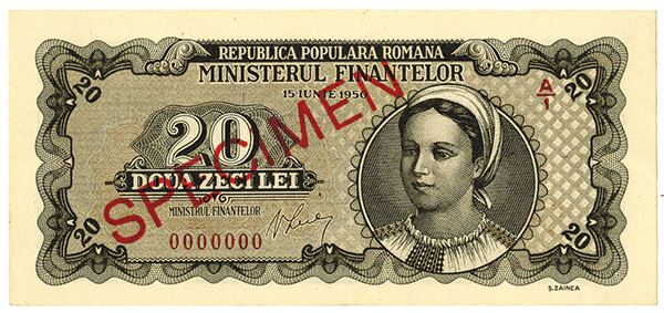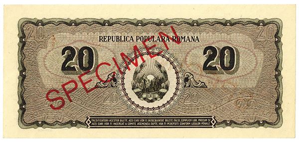 RomaniaÉ.... Lot includes a Ministry of Finance specimen 20 Lei note, with "SPECIMEN" overprint and s/n A1 0000000. P-84s. Choice to Gem Unc.