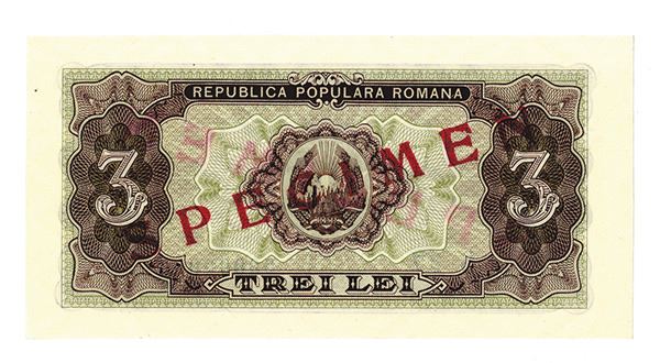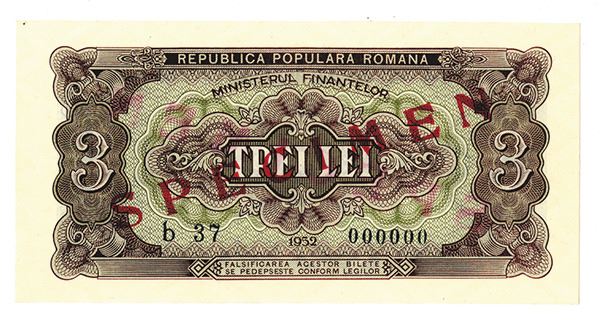 RomaniaÉ.. Lot includes a Ministry of Finance specimen 3 Lei note, with "SPECIMEN" overprint and s/n A1 0000000. P-82s. Choice to Gem Unc.