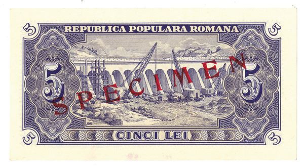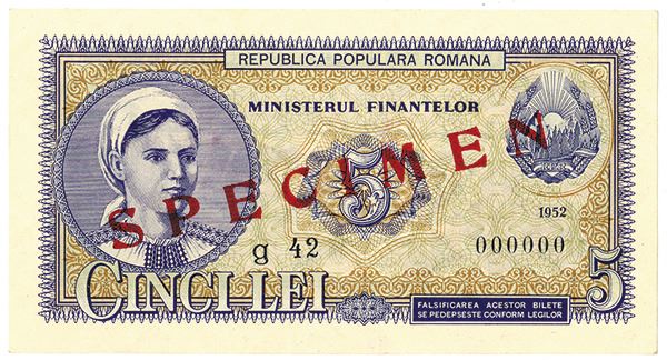 RomaniaÉ.. Lot includes a Ministry of Finance specimen 5 Lei note, with "SPECIMEN" overprint and s/n g42 000000. P-83s. About to Choice Unc.