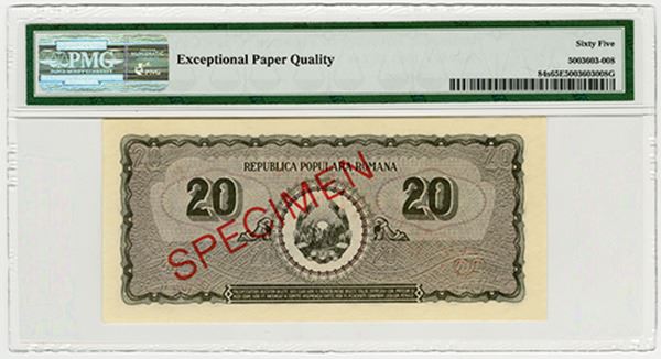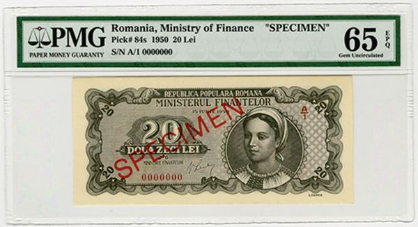 Romania. Specimen 20 Lei, 1950, P-84s. PMG graded Gem Unc 65 EPQ (Cert # 5003603-008).