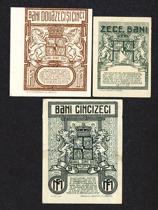 Romania. 10, 25, 50 Bani. P-69, 70, 71. Ferdinand I at center, crowned and supported arms on back. Small format. First two are Choice Uncirculated; last is Uncirculated but with an unusual paper issue from the production process. 3 pieces.