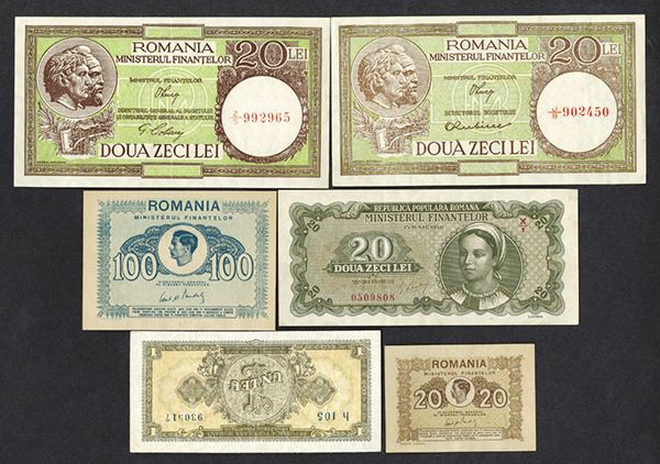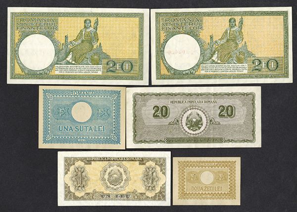 Romania, issued group of notes, includes 20 Lei, P-76; 100 Lei, P-78; 20 Lei, P-79 and P-80; 1 Leu, P-81; and 20 Lei, P-84.