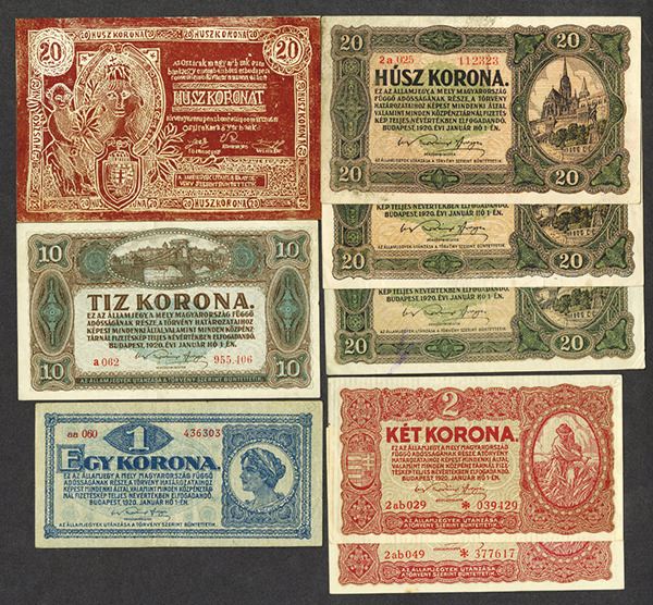 Hungary. 1, 2, 10, 20 Korona. P-57; 58 (2); 60; 61 (3). Mostly Very Fine. Plus a 20 Korona which looks as if it was done as a linoleum block print. 8 pieces.