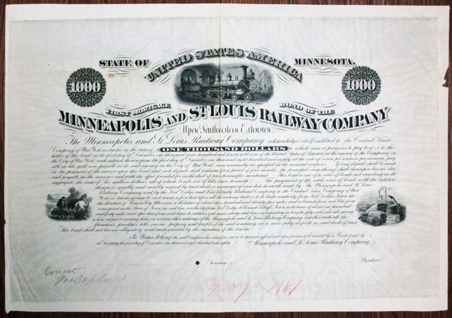 Minnesota, 1881. $1000 Proof 7% First Mortgage bond, Southwestern Extension, Printed on india paper, Black text with train exiting tunnel at top center. Includes approval initials at bottom, and writing in pencil. POCs. VF condition. This is the exact example pictured in Cox and is possibly unique.