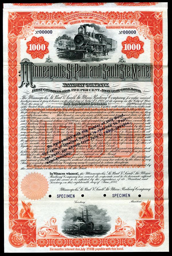 Michigan, Wisconsin, Minnesota, Territory of Dakota, 1888, $1000 1st Consolidated 5% 50 Year Gold Specimen Bond, Black printing with orange border and underprint, Moving locomotive with man watching top center, POC's and blue SPECIMEN overprints, VF condition, ABNC. Listed railroad and bond in Cox.